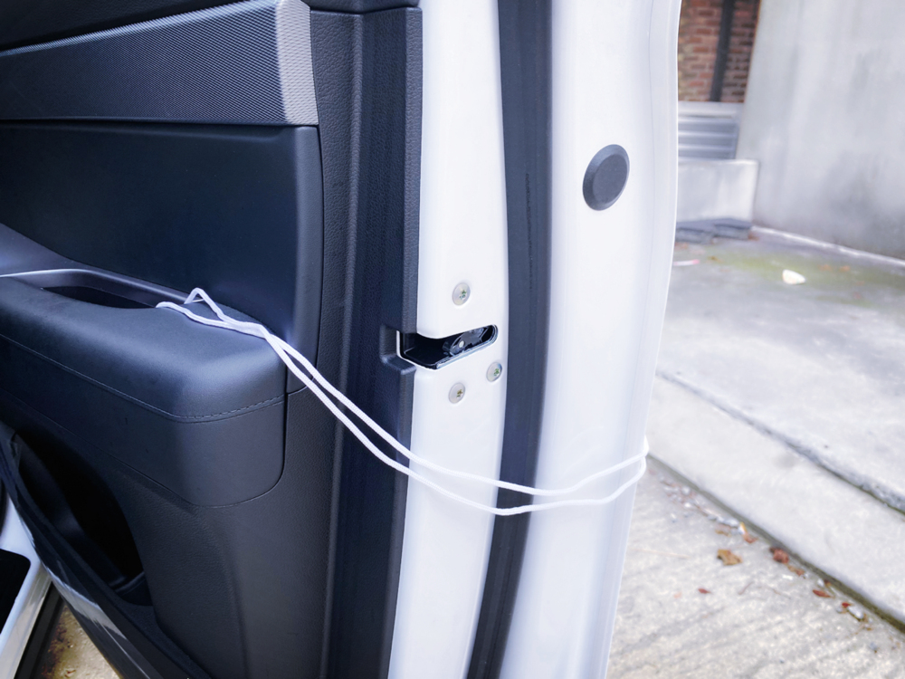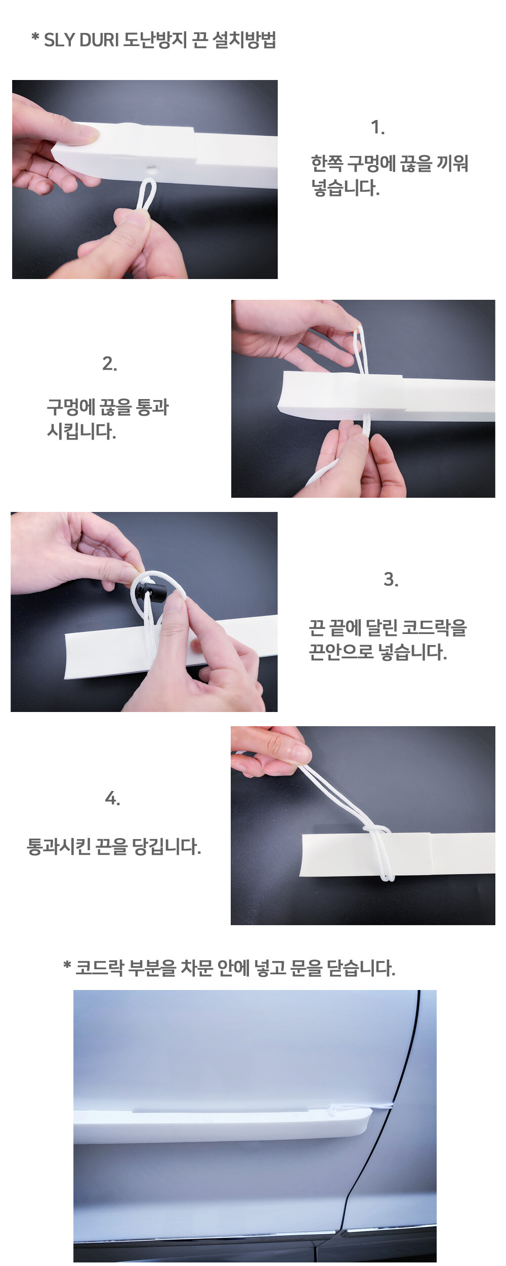 사진과 같이 도난방지 끈을 끼우시고, 차안에 코드락 부분을 넣으시고, 차문을 닫으시면 됩니다.